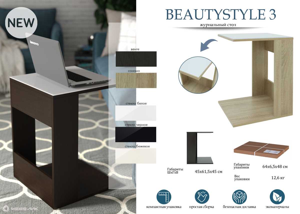 Приставной стол от бренда Мебелик с артикулом 002297 c основанием из ЛДСП и прямоугольной столешницей из ЛДСП и стекла станет незаменимым дополнением для интерьера гостиной в современном стиле. Российский товар черного цвета с шириной в 45 см, глубиной в 45 см и высотой 61.5 см и не оборудован ящиками. Конструкция с двумя ножками без колес не регулируется по высоте. У модели нет полки. Приставной стол Мебелик BeautyStyle 3 002297 поставляется по цене 3984 RUB и доставляется в кратчайшие сроки по Москве и всей России. Изучите отзывы пользователей, фото и характеристики и делайте заказ в интернет-магазине Вамсвет.